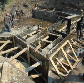 Inzwischen wurden die Rohre verlegt und das Einlasswehr wird gegraben und betoniert. Ein Traktor hilft, Materialien auf die ansteigende und unebene Straße zu bringen. Trotz aller Herausforderungen gehen die Arbeiten gut voran.